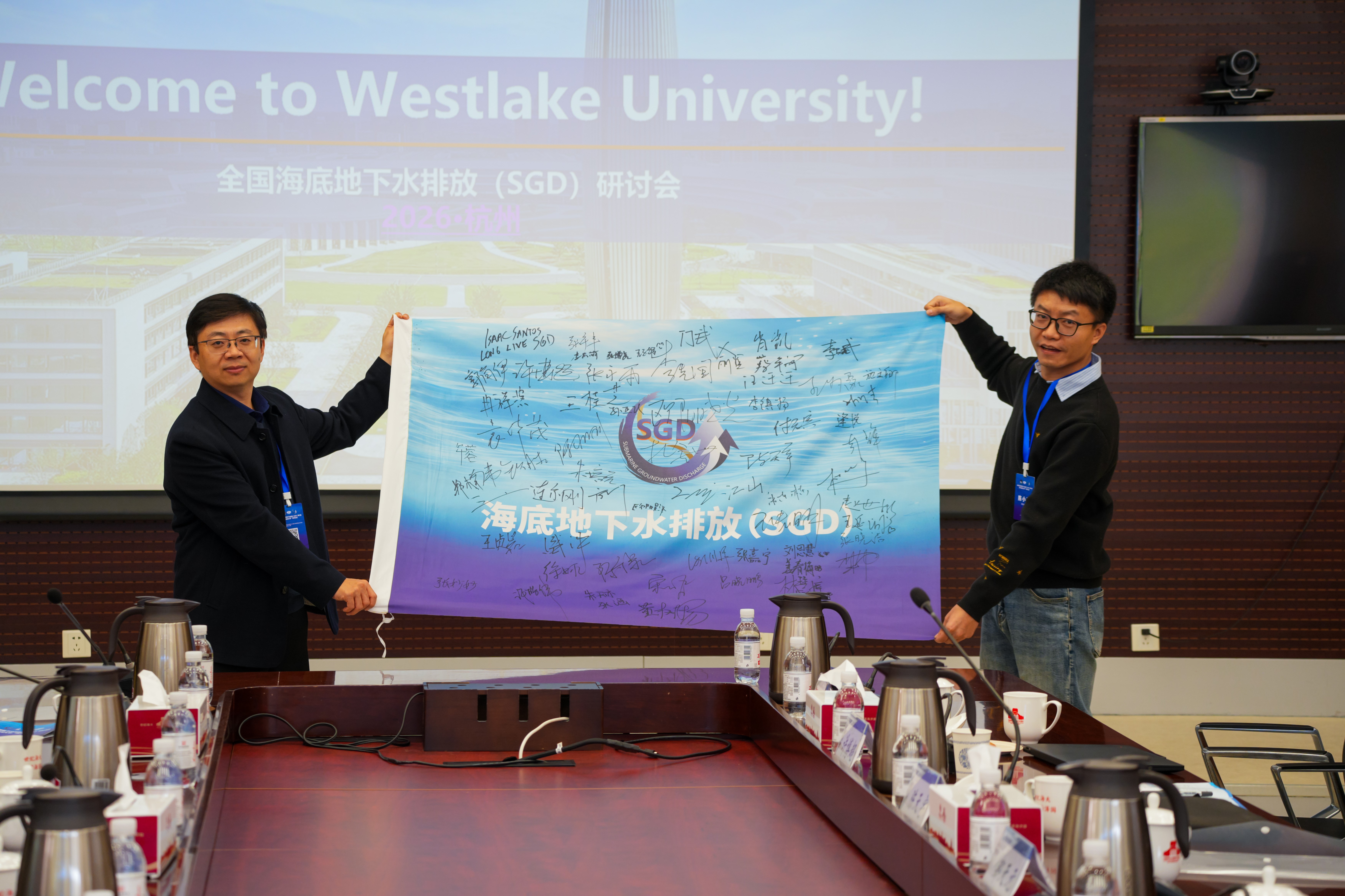 会议还就SGD的发展前景和存在问题进行深入研讨,取得了丰硕成果,成功搭建了我国海底地下水排放研究的全国性学术交流平台。会议最后举行了会旗传递仪式,由中国海洋大学许博超教授将海底地下水排放(SGD)研讨会会旗交给第二届研讨会承办单位西湖大学陈小刚副教授。