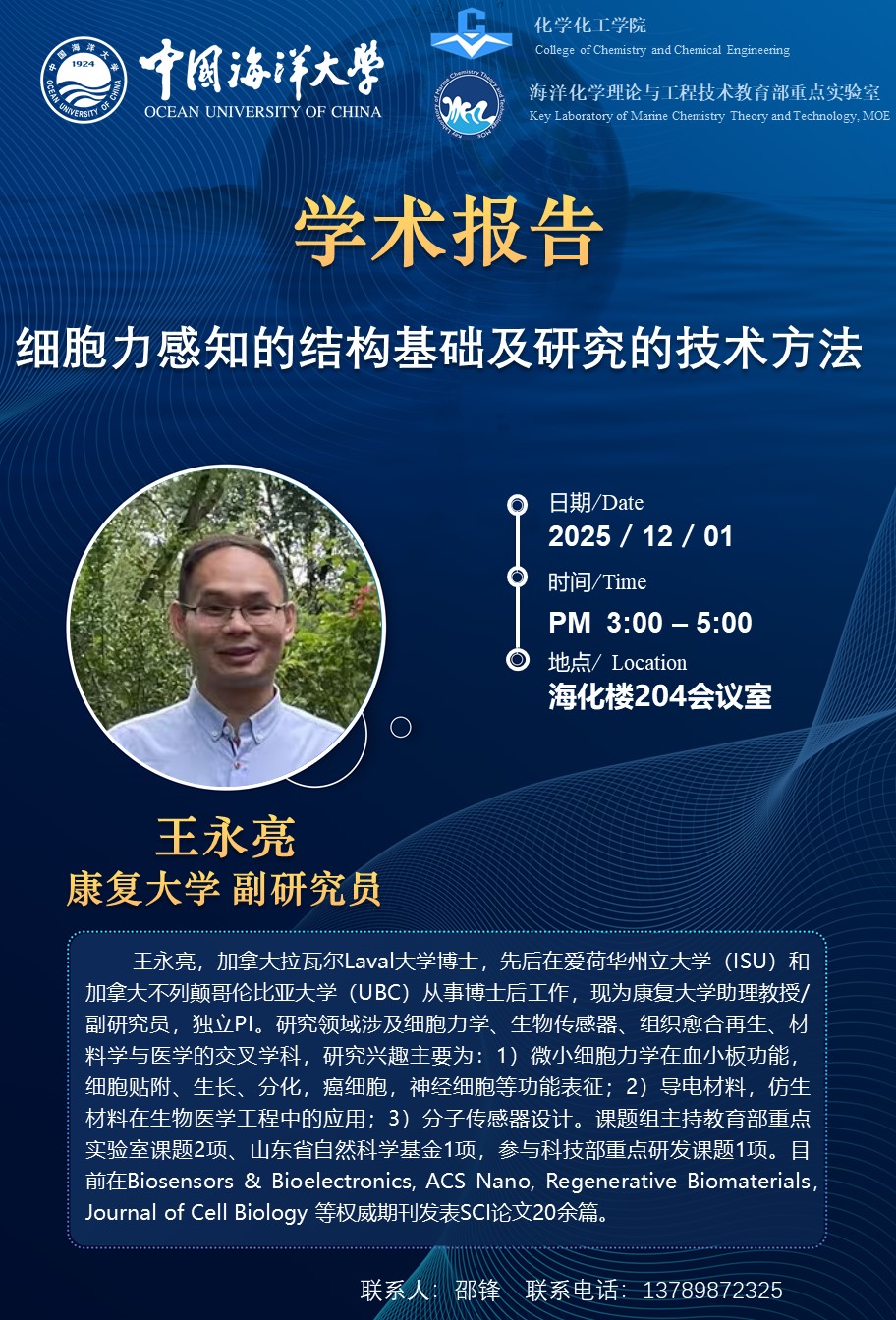 12月1日 王永亮副研究员报告:细胞力感知的结构基础及研究的技术方法
