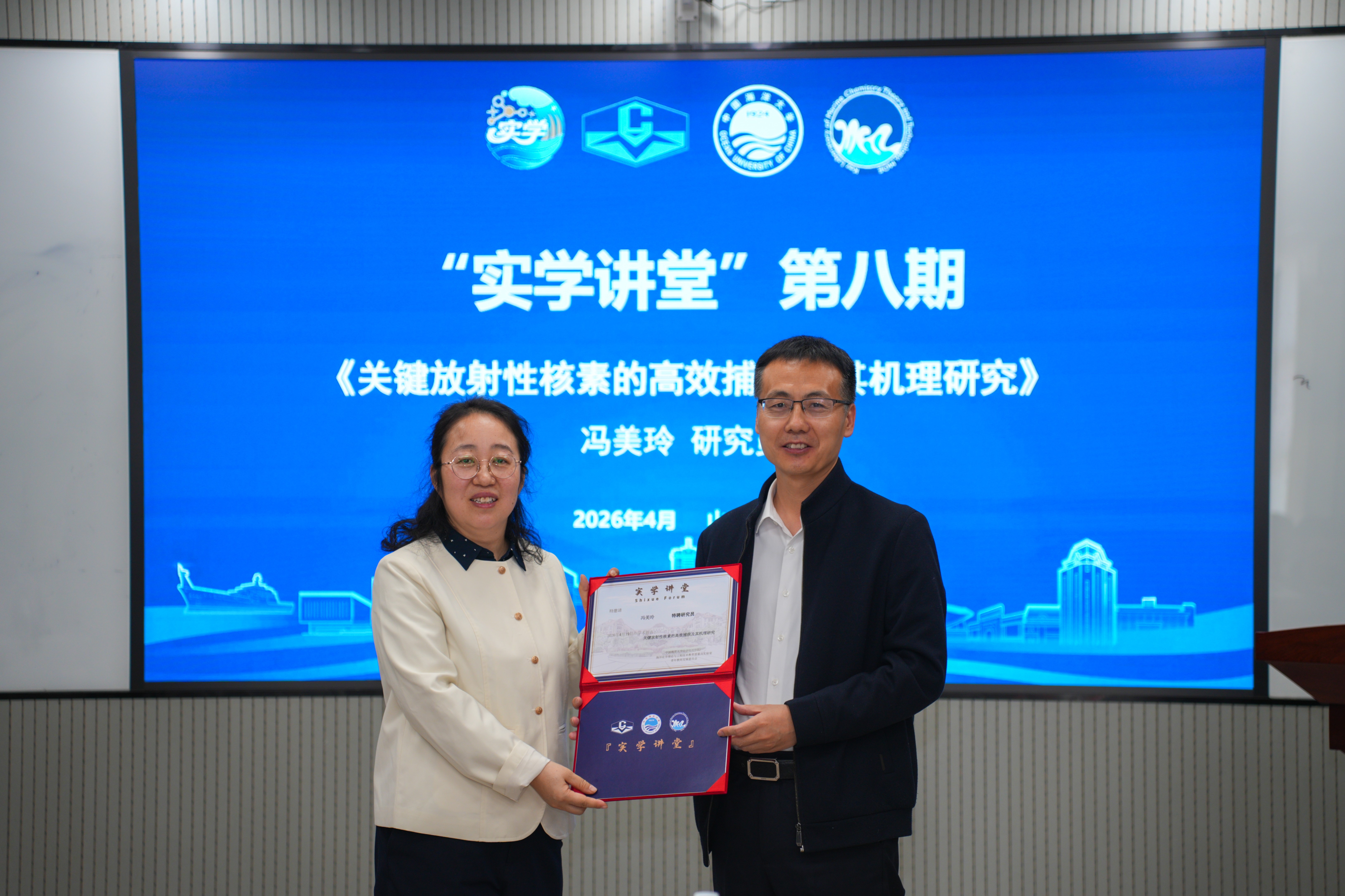 2026年4月19日上午,由中国海洋大学海洋化学理论与工程技术教育部重点实验室/化学化工学院主办的“实学讲堂”第八期活动在中国海洋大学化学化工学院多功能厅举行。本次活动邀请到中国科学院福建物质结构研究所冯美玲研究员作题为《关键放射性核素的高效捕获及其机理研究》的学术报告。本次报告由中国海洋大学化学化工学院孟祥超教授主持。