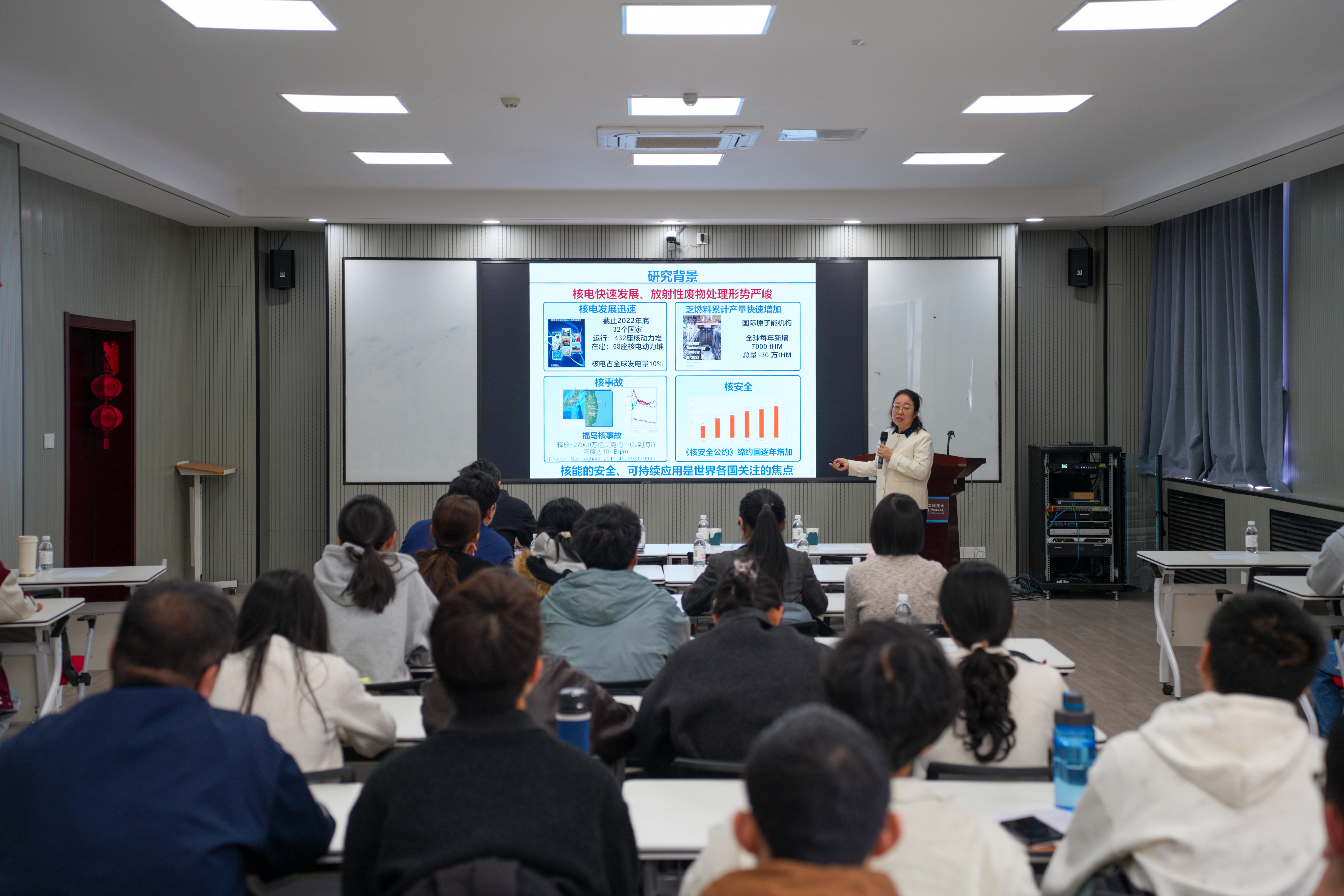 冯美玲研究员在报告中系统介绍了关键放射性核素高效捕获研究的战略意义、放射性核素分离富集功能材料的核心价值、核素高效捕获材料的精准设计方法与吸附机理调控机制、关键核素捕获材料在核废料后处理及环境放射性污染修复中的创新应用等。在互动交流环节,与会师生踊跃积极提问,就关键放射性核素捕获材料设计、核素检测手段、复杂体系下核素选择性分离性能等问题与冯美玲研究员展开了深入的交流和热烈的讨论。