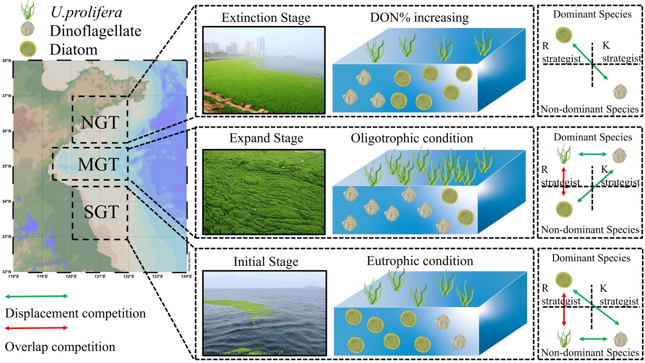 l 格局反转:正是这一过程,导致了黄海青岛近海绿潮消亡区呈现独特的“甲藻(春)-浒苔(夏)-硅藻(夏末)”演替格局,与非绿潮消亡区经典的“硅藻(春)-甲藻(夏)”格局截然相反。这一机制通过培养实验(如微小原甲藻和旋链角毛藻对不同老化阶段DON的响应差异)和现场相关性分析获得了双重验证(图4)。