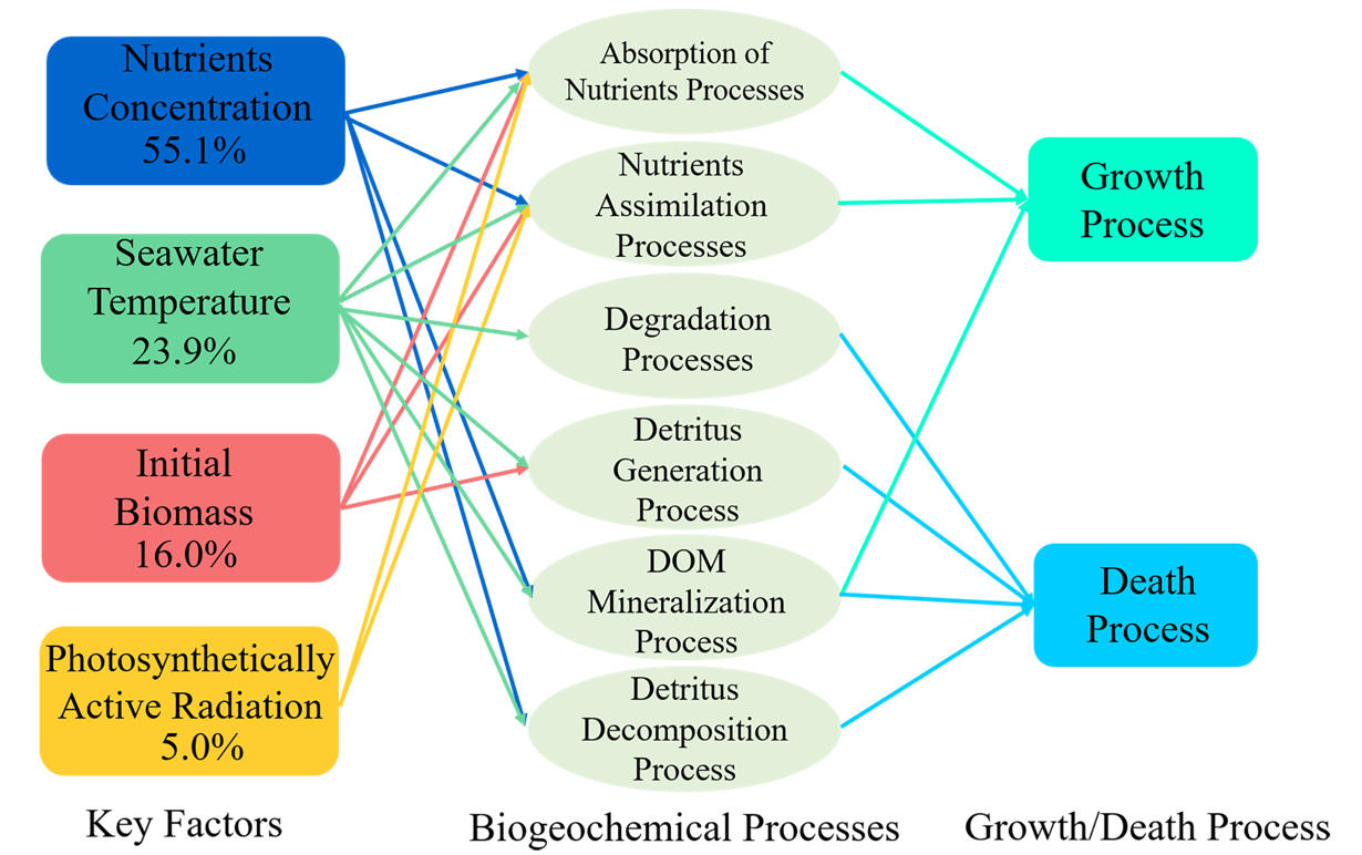 课题组构建了营养盐-浒苔-微藻-碎屑(NUMAD)生物地球化学模型,通过参数敏感性分析和数值实验,首次定量化揭示了不同要素的调控贡献率,并阐明了浒苔与浮游微藻的竞争关系(图2)。
