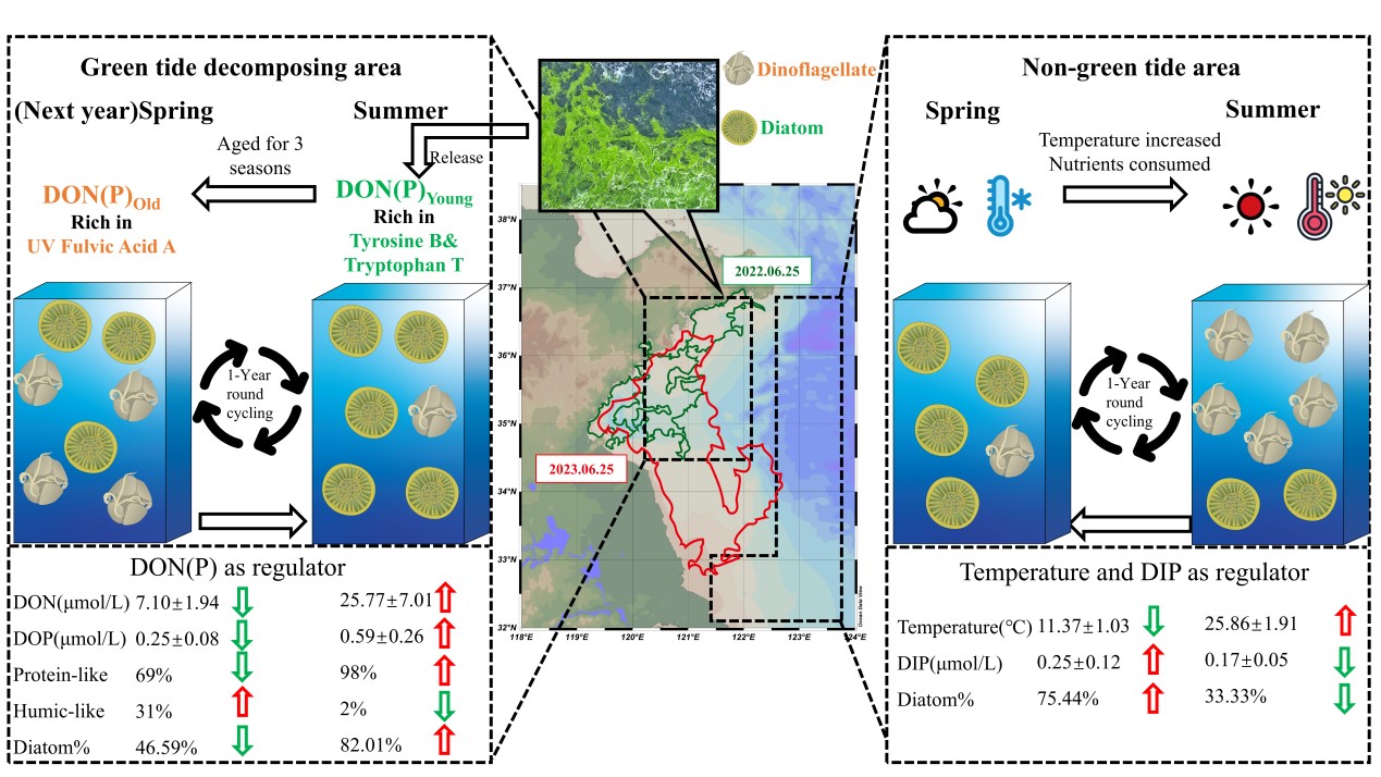 图4 南黄海浒苔绿潮消亡区和非消亡区硅藻-甲藻演替格局转变的浒苔源DON老化过程调控机制示意图(详见本站报道https://mctl.ouc.edu.cn/2025/0227/c28429a494603/page.htm)。