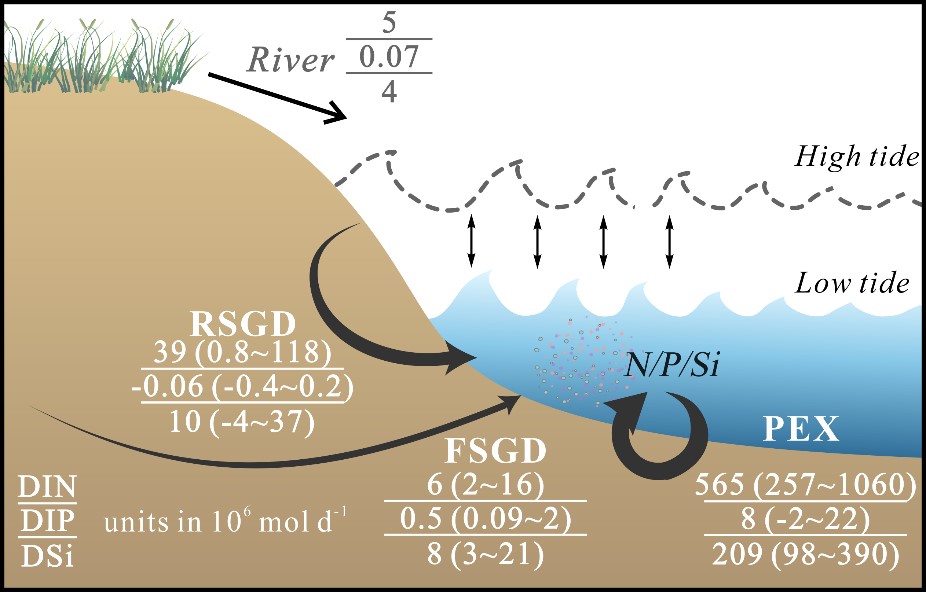 近日,中国海洋大学海洋化学理论与工程技术教育部重点实验室于志刚教授、许博超教授团队在地学领域权威学术期刊Geochimica et Cosmochimica Acta发表题为“Radium and radon isotopes reveal multi-scale porewater and groundwater nutrient sources in a macrotidal embayment”的研究论文,在近海海底地下水排放(SGD)动力学特征及其营养盐通量贡献研究方面取得新进展。研究结果揭示了杭州湾这一强潮型海湾中的SGD过程以发生在厘米尺度的间隙水交换为主,并且是该海域中溶解无机态营养盐的重要来源,强烈的潮汐作用是该海域间隙水交换的主要驱动力。